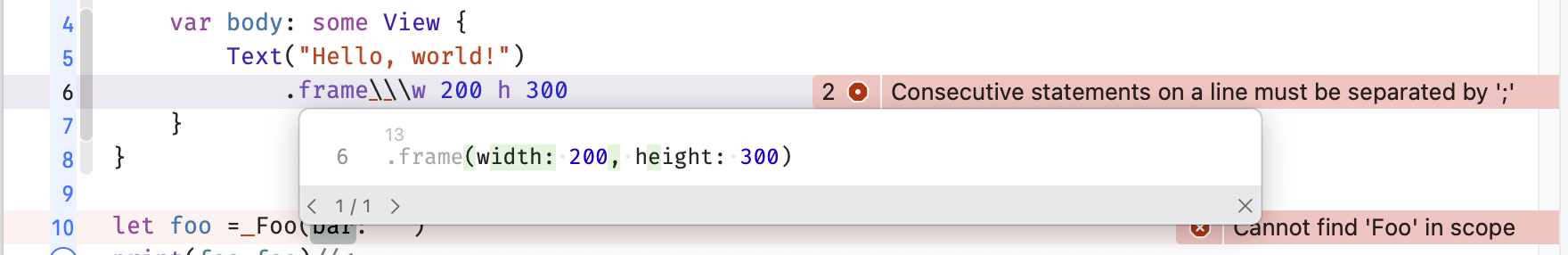 \\\ instructionsto instruct the suggestions. For example, typing.frame\\\width 30 height 100will instruct the suggestion to be.frame(width: 30, height: 100).If you want the suggestion to rewrite the whole line, you can use